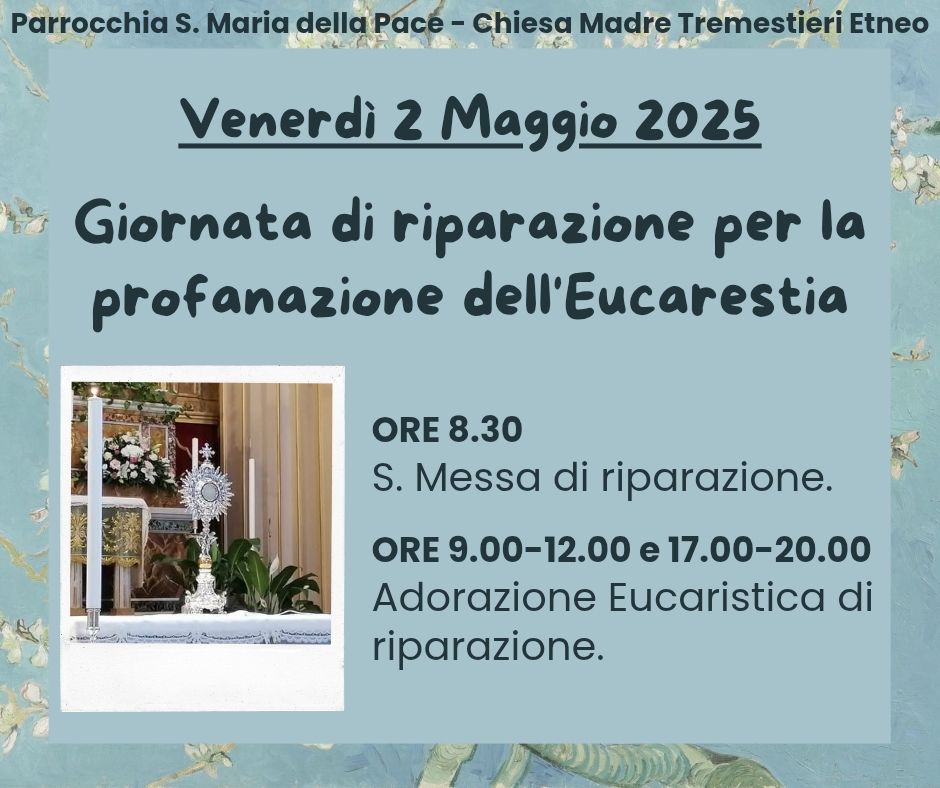 A seguito del furto sacrilego della SS. Eucarestia avvenuto il 25 aprile u.s. nella cappella dell’oratorio S. Giovanni Paolo II nel quartiere di Fossa Creta di Catania, ci riuniremo per offrire preghiere di riparazione per il gravissimo gesto di profanazione.